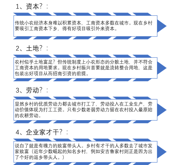 四大產(chǎn)業(yè)要素,過去幾十年大多數(shù)鄉(xiāng)村其實個個都缺少。難怪鄉(xiāng)村不凋敝。如今要鄉(xiāng)村振興,一言以蔽之就是要解決“三個從哪里來”的問題: