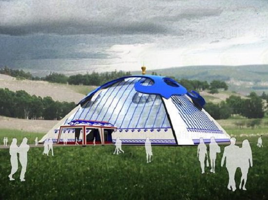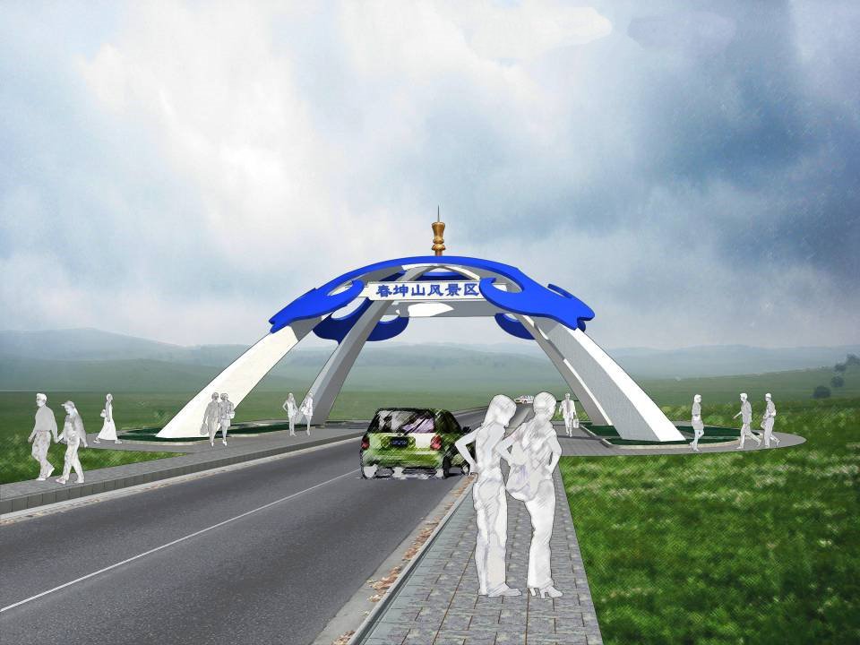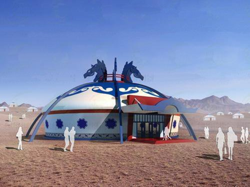 我們把蒙古族文化符號融入現(xiàn)代建筑中,使之具備休閑酒店功能。這種蒙古包式酒店采用現(xiàn)代建筑材,屋頂和雨棚等地方則運(yùn)用了蒙古族圖騰圖案。整體色調(diào)采用藍(lán)白紅三色,從而與草原的藍(lán)天白云意境相襯托。
