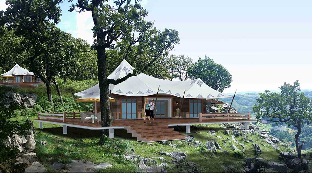 由一個或多個模塊組建構成,用戶可根據(jù)自己的需要決定配置的功能模塊和設備組建。這種結構便于以后的維修,拆卸和功能調整。已經(jīng)搭建好的帳篷客房也可根據(jù)需要拆卸、移動、安裝;隨時更新模塊組建改變主題;使用過的帳篷客房可回收更新后再利用到其他項目中。集成化帳篷客房安裝供電供水設備后,可單體使用也可多個客房組合使用,更可以組合成中、大型客房集群,具備餐飲、休閑等生活性服務功能。其“設施平臺+功能模塊”的結構,使上層建筑(帳篷、整體衛(wèi)生間)造型比較靈活,地域文化的融入度高,若根據(jù)景區(qū)或整體景觀設計,植入主題或文化元素,將達到更好的景觀效果。