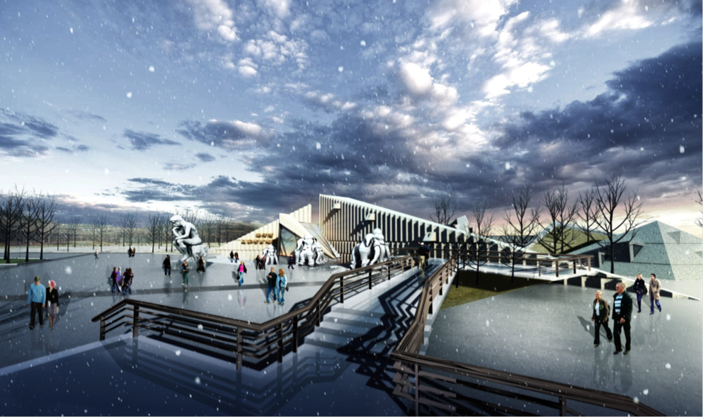 主入口景觀意象圖“沉思”取材于羅丹雕塑“思想者”,反映人類文明的啟蒙。