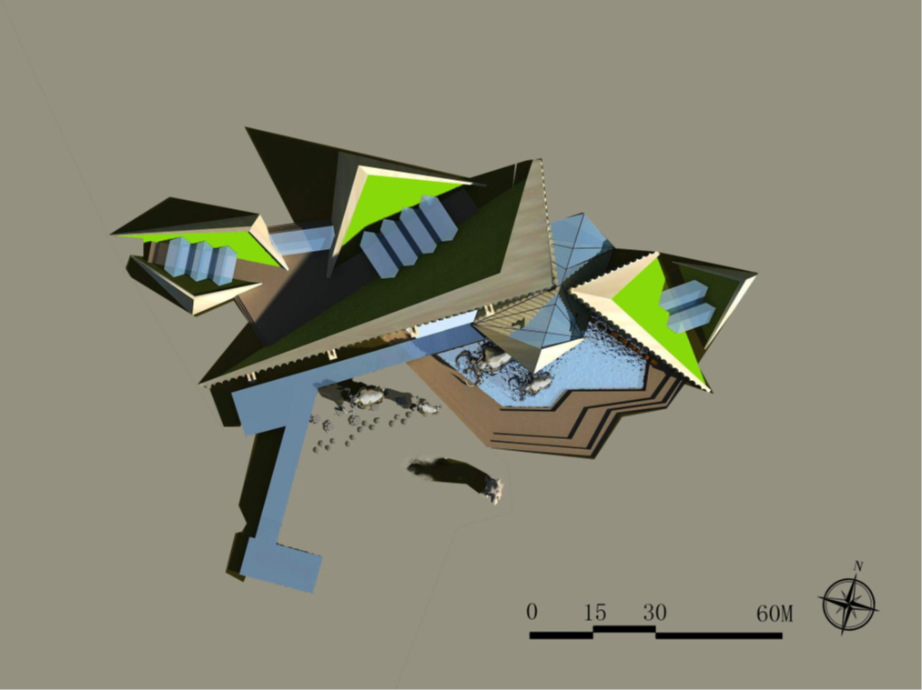 三組錯(cuò)落有致的人字形母題,構(gòu)成了建筑的地上覆土坡屋頂。建筑地上主體一層,局部二層,高度12.8米,地下局部一層