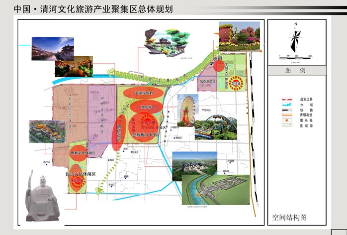 一、文旅業(yè)——城市雄心的下一塊拼圖城市是棋盤(pán),旅游業(yè)就是其中一個(gè)棋子。這枚棋子在清河城市運(yùn)營(yíng)大棋局中,究竟充當(dāng)什么功能、扮演什么角色呢? 1、 “冀東南區(qū)域中心城市”的城市雄心改革開(kāi)放的東風(fēng),以及清河人 “敢創(chuàng)偉業(yè),事?tīng)?zhēng)一流”的清河精神,讓清河縣創(chuàng)造了一個(gè)個(gè)產(chǎn)業(yè)奇跡!清河在自身不出產(chǎn)半兩羊絨的基礎(chǔ)上,硬是打造出了“中國(guó)羊絨之都”,此外還奮發(fā)自強(qiáng)打造出了汽配產(chǎn)業(yè)、合金產(chǎn)業(yè)等支柱產(chǎn)業(yè)。被河北省命名為“發(fā)展民營(yíng)經(jīng)濟(jì)先進(jìn)縣”。 河北省“十一五”規(guī)劃期間,清河被列入全省首批擴(kuò)權(quán)縣和重點(diǎn)培育的中等城市之一; 清河縣“十二五”規(guī)劃綱要也提出:到“十二五”末,把清河基本建成冀東南區(qū)域中心城市。 ……一座冀東南區(qū)域中心城市的雛形正在形成。 2、城市雄心的“三缺一”然而,一座真正意義上的區(qū)域中心城市僅僅有產(chǎn)業(yè)活力還是不夠的!根據(jù)國(guó)內(nèi)外城市運(yùn)營(yíng)普遍經(jīng)驗(yàn),作為區(qū)域中心城市,應(yīng)該具備“城市三力”:空間形態(tài)引力,產(chǎn)業(yè)經(jīng)濟(jì)活力,精神文化魅力。 分析: (1)產(chǎn)業(yè)經(jīng)濟(jì)活力: 是清河打造區(qū)域中心城市既有優(yōu)勢(shì); (2)空間形態(tài)引力: 部分城市地段形態(tài)令人耳目一新,例如羊絨市場(chǎng)板塊集工貿(mào)游一體、現(xiàn)代化氣息盎然,頗具大中城市味道。 但整體上,中等城市骨架以及空間形態(tài)打造還在雛形中 (3)精神文化魅力: 精神文化魅力遠(yuǎn)遠(yuǎn)不足! 清河是天下張氏祖源地,通過(guò)張氏聯(lián)誼總會(huì)以及張氏祖庭營(yíng)造,已初步打造出張氏祖源文化——但還有大量潛力可挖掘而沒(méi)得到挖掘。 清河也是“武松、武大郎、潘金蓮”傳說(shuō)重要所在地,《水滸傳》中明確記載的三人出生地在清河——“武松故里”這一張文化名片的塑造,尚未成形。遠(yuǎn)遠(yuǎn)落后與陽(yáng)谷、臨清等地對(duì)這一傳說(shuō)的利用。 3、旅游業(yè)成就下一塊拼圖所謂“文化是旅游的靈魂,旅游是文化的載體”—— 無(wú)論是“張氏祖源文化”的深入挖掘,還是“武松故里文化”的競(jìng)爭(zhēng)性開(kāi)發(fā),都離不開(kāi)旅游業(yè)載體。 通過(guò)旅游業(yè)發(fā)展,不僅僅是為清河增添了一個(gè)產(chǎn)業(yè)。更重要的是強(qiáng)化了清河 “精神文化魅力”促進(jìn)清河城市形象營(yíng)銷;并且反促進(jìn)清河“產(chǎn)業(yè)經(jīng)濟(jì)活力、空間形態(tài)引力”: 清河縣縣城西北部具備形成“文化旅游產(chǎn)業(yè)聚集區(qū)”的可能性。因?yàn)檫@一片區(qū)不僅是資源相對(duì)富集,而且依托縣城,有良好的交通、市場(chǎng)區(qū)位、人力、基礎(chǔ)設(shè)施等要素聚集。 因此,清河旅游突破,必須拋棄“撒胡椒面”思想。以西北部“文化旅游產(chǎn)業(yè)聚集區(qū)”為引擎。 二、文化產(chǎn)業(yè)集聚區(qū)策劃1、空間范圍:坐落在以縣城為中心的西北部,指從西部的張氏祖庭、崇興寺、快活林、貝洲古城一直到北部清涼江生態(tài)園這一范圍。 該聚集區(qū)劃分為 “兩帶六區(qū)”。“兩帶”指清涼江生態(tài)景觀帶、大運(yùn)河綜合景觀帶;“六區(qū)”指羊絨文化體驗(yàn)區(qū)、城市游憩區(qū)、貝州古城體驗(yàn)區(qū)、戶外運(yùn)動(dòng)休閑區(qū)、張氏文化休閑區(qū)、鄉(xiāng)村生態(tài)體驗(yàn)區(qū)。 這一范圍內(nèi)有樹(shù)林、湖泊等自然資源,也有張氏祖庭、寺廟等文化資源;并且在區(qū)位上相對(duì)集中有利于產(chǎn)生聚集規(guī)模效益;且環(huán)繞縣城有較好基礎(chǔ)設(shè)施依托。因?yàn)榻ㄗh規(guī)劃成“文化旅游產(chǎn)業(yè)集聚區(qū)”,成為清河旅游開(kāi)發(fā)的領(lǐng)航項(xiàng)目。 2、支撐項(xiàng)目:主要項(xiàng)目構(gòu)成有:清河羊絨城、貝州古城、清河湖、溫泉度假莊園、金瓶梅文化園、隋唐大運(yùn)河、張氏祖庭、張氏會(huì)館、張氏文化一條街、清涼江生態(tài)園、百果園、青少年見(jiàn)學(xué)基地等。